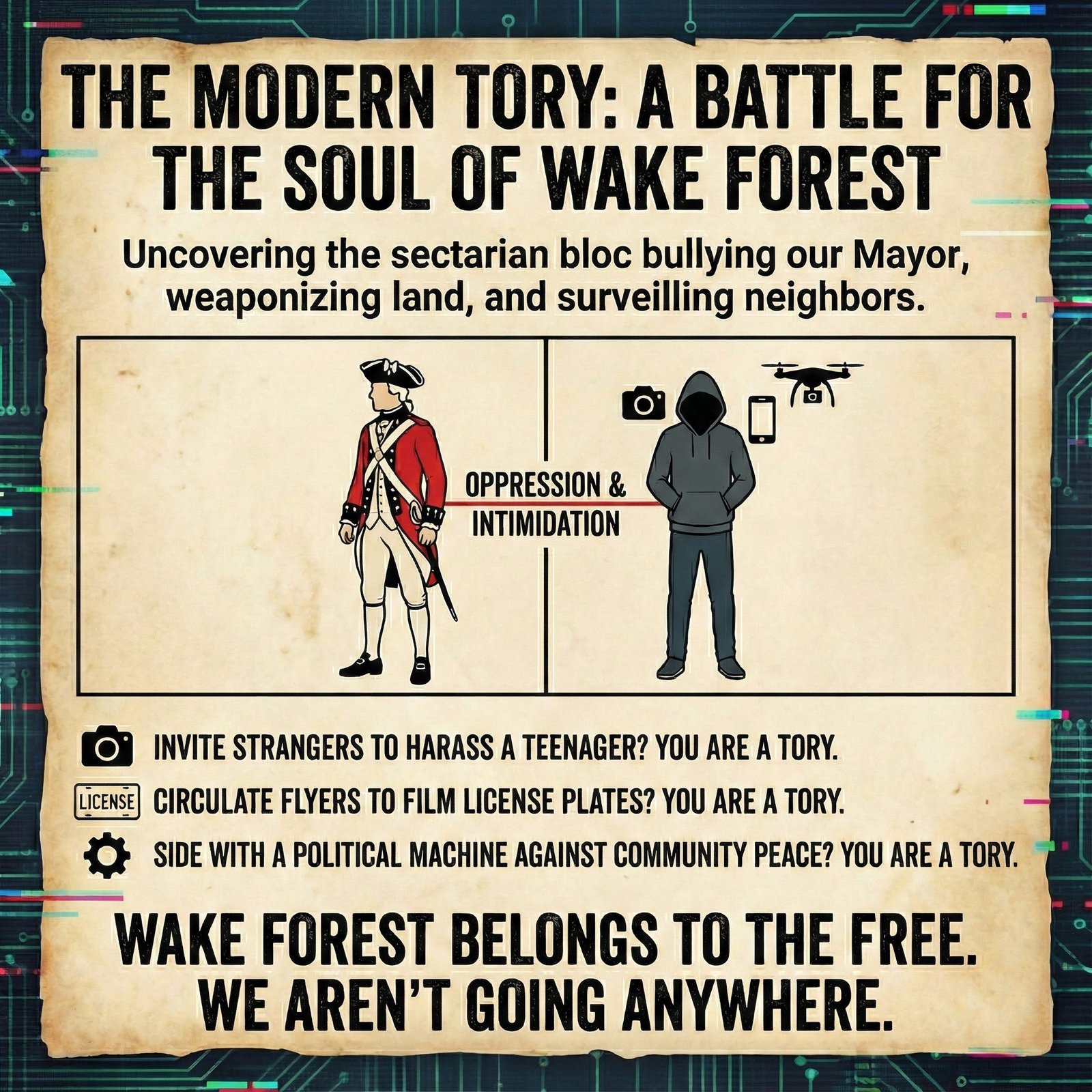We know who invited the harassment. You are not invisible. To those who think they can bully this town into silence: You are betting against history. You are acting like the redcoats and the loyalists who believed they could rule by fear. You lost then. You will lose now. Wake Forest belongs to the free. And we aren’t going anywhere.