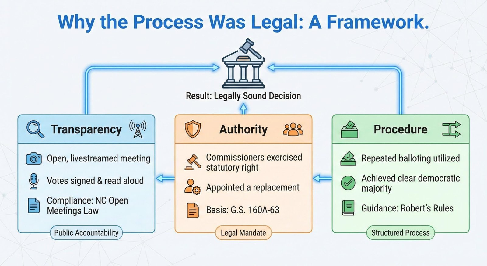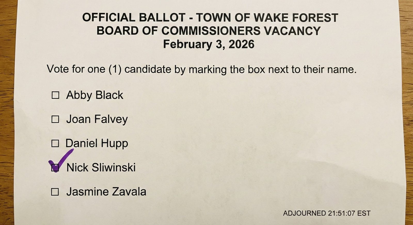 Second, the voting method itself was designed to satisfy North Carolinaâs rigid transparency laws. While the use of paper ballots might have looked like a dramatic flourish, it was a compliance necessity. Elected officials cannot vote by secret ballot. By requiring each Commissioner to sign their name and having the Town Clerk read the votes aloud, the Town Attorney ensured the process satisfied the âopen voteâ mandates of public records law.