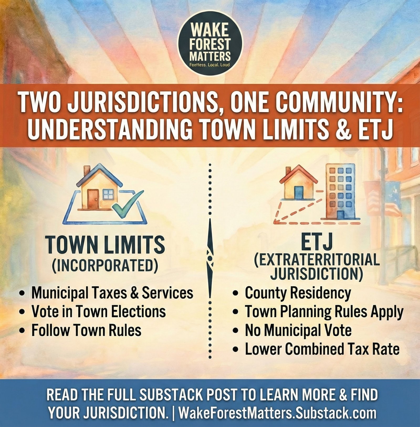 Two neighbors can share the same Wake Forest âidentityâ (ZIP code, schools, stores, local roads) and still fall under different legal jurisdictions.