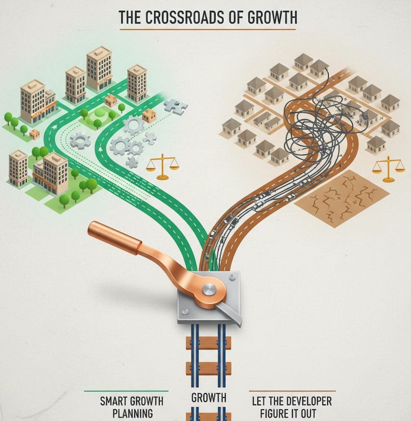 The choices we make about growth profoundly shape our community’s future. This visual illustrates the two distinct paths Wake Forest faces: one of thoughtful, integrated “Smart Growth Planning” that leads to fiscal balance and a thriving town, and another of uncoordinated development that often leaves us with sprawling, inefficient outcomes. Which path will we choose?